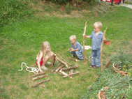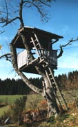 Baumhaus, Weidenhütte, Blockhütte und einer Seilbahn.