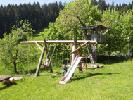 der Spielwiese einen Spielplatz mit Schaukeln, Rutschbahn, Sandkasten,